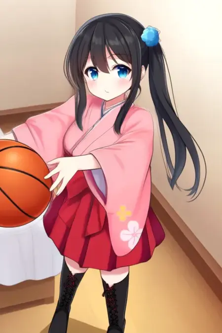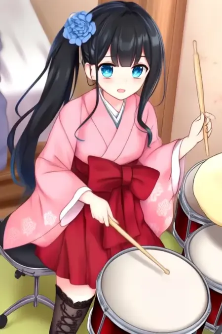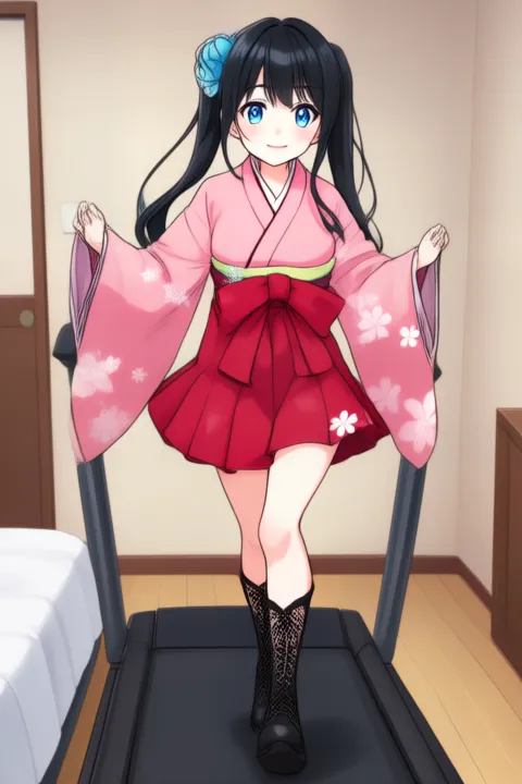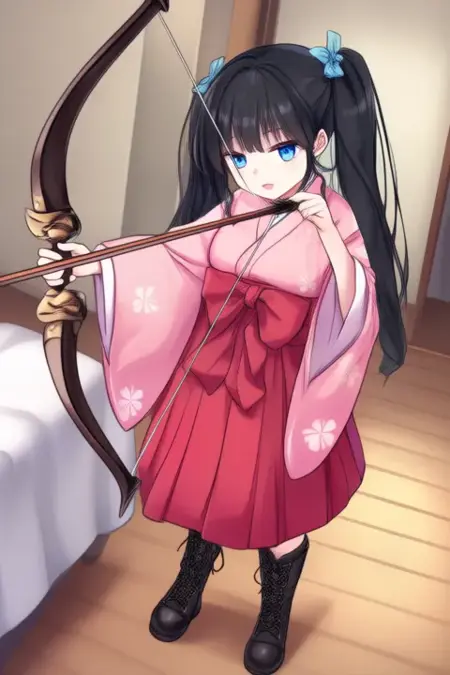 サンプルプロンプト: Oomachi Haruka、アニメスタイルの少女。画像には、長い黒髪を二つのポニーテールにまとめ、それぞれに青色の髪飾りが付いたアニメスタイルのキャラクターが描かれています。キャラクターは鮮やかな青い目をしており、伝統的な日本の着物を着ています。着物は主にピンク色で、白い花模様があり、前面には大きな赤いリボンがついています。また、彼女は黒いラップアップブーツを履いています。 (彼女は踊っています:2.5)、(ちびネンドロイド:3.5)、寝室で。