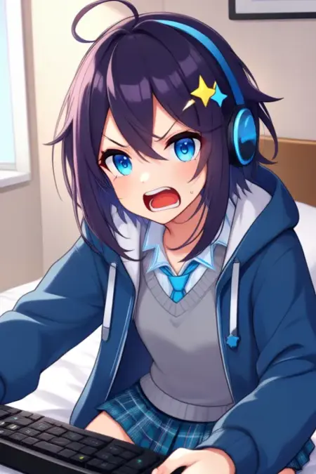 触发词:Sorahoshi Kirame,动漫风格女孩。图像包含一位动漫风格的角色,拥有深紫色头发,以凌乱的发髻造型呈现,两侧配有两枚星形饰品。角色拥有醒目蓝色双眼,身穿带有白色点缀的蓝色连帽衫,内搭灰色毛衣,下身穿着蓝色格子裙,脖子上系着浅蓝色饰物。