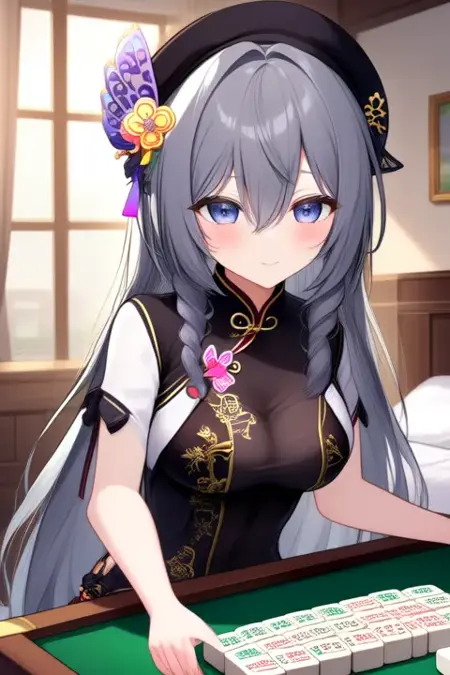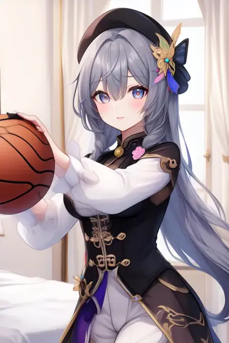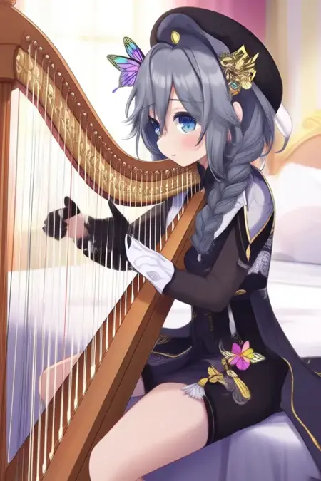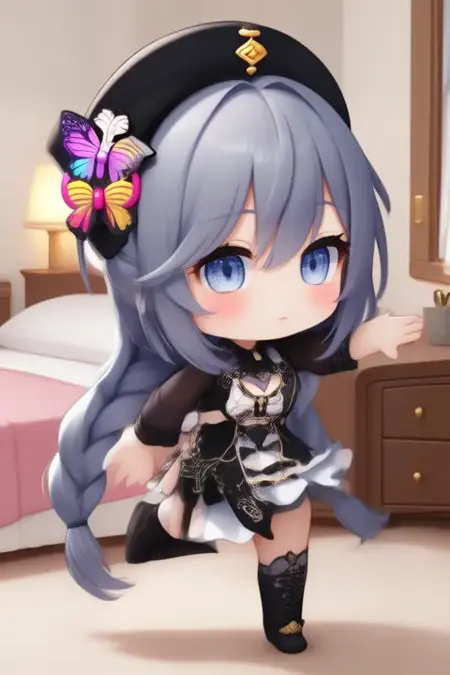 sample prompt:Kisara, anime-style girl. The image features a character with long, silver-gray hair styled in two braids. The hair is adorned with a decorative butterfly accessory on the left side. The character has blue eyes and is wearing a black hat adorned with gold buttons and a pink and yellow bow on the side, and is wearing a black and white outfit with intricate designs. The outfit includes a high collar, a black vest over a white blouse, and a black skirt with gold accents. The character is also wearing a black hat with gold embellishments. (she is dancing:2.5), (chibi Nendoroid:3.5) in bedroom.