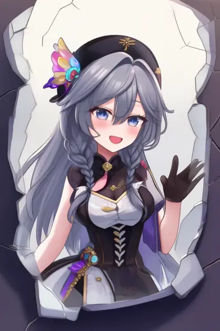 Trigger Word:Kisara, anime-style girl. The image features a character with long, silver-gray hair styled in two braids. The hair is adorned with a decorative butterfly accessory on the left side. The character has blue eyes and is wearing a black hat adorned with gold buttons and a pink and yellow bow on the side, and is wearing a black and white outfit with intricate designs. The outfit includes a high collar, a black vest over a white blouse, and a black skirt with gold accents. The character is also wearing a black hat with gold embellishments.