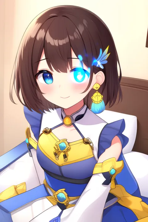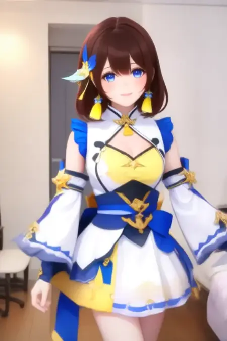 触发词:Shiga Riko,动漫风格女孩。图像中的角色为动漫风格,拥有短而随意打理的棕色头发,大而富有表现力的蓝色眼睛十分突出。角色佩戴一对大型装饰性耳环,呈翅膀形状,配有蓝黄配色。身穿色彩鲜艳的服装,包括白色上衣,带有蓝色点缀和黄色细节,胸前系有蝴蝶结,搭配同色系短裙和蓝色腰带。