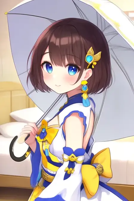 示例提示词:Shiga Riko,动漫风格女孩。图像中的角色为动漫风格,拥有短而随意打理的棕色头发,大而富有表现力的蓝色眼睛十分突出。角色佩戴一对大型装饰性耳环,呈翅膀形状,配有蓝黄配色。身穿色彩鲜艳的服装,包括白色上衣,带有蓝色点缀和黄色细节,胸前系有蝴蝶结,搭配同色系短裙和蓝色腰带。(她正在跳舞:2.5),(Q版Nendoroid:3.5)在卧室中。