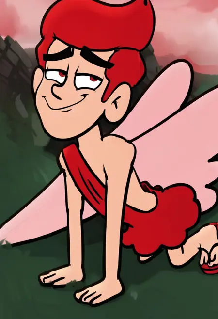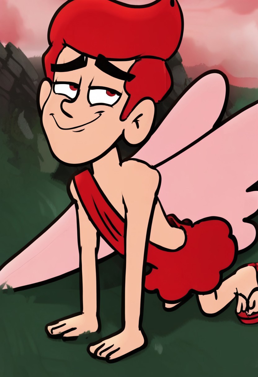 Cupid_(Fresh), 1boy, solo, red hair, no shirt, red sash, sash, sandals, red sandals, wings, pink wings