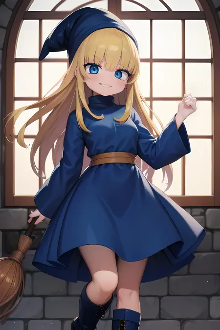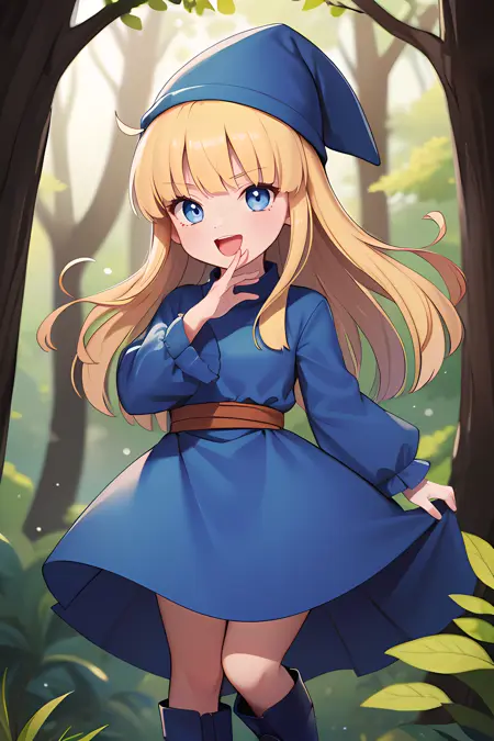 추천 프롬프트: 긴 머리, 금발, 둔한 앞머리, 파란 눈, 파란 모자, 파란 드레스, 파란 부츠, 빨간 띠, 긴 소매