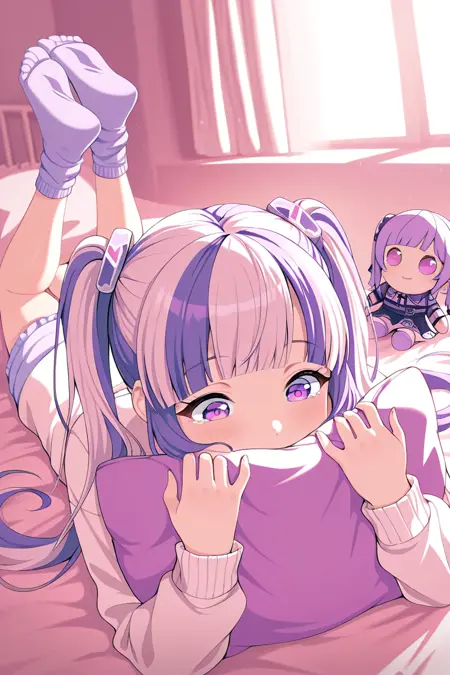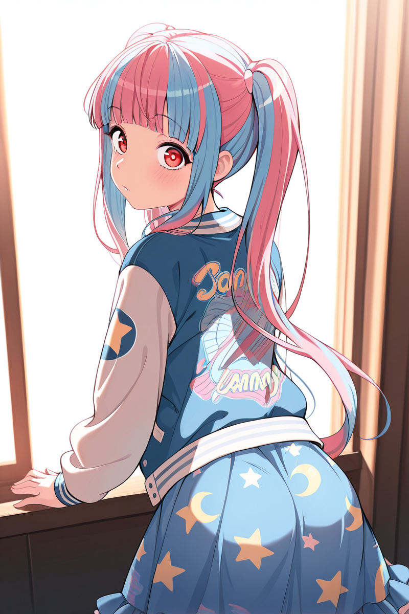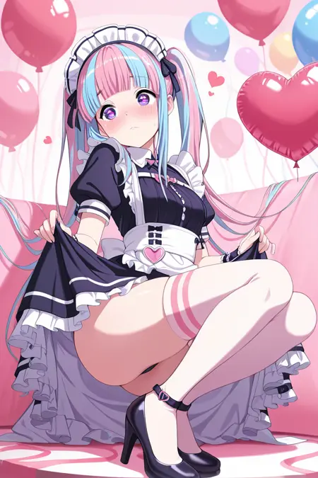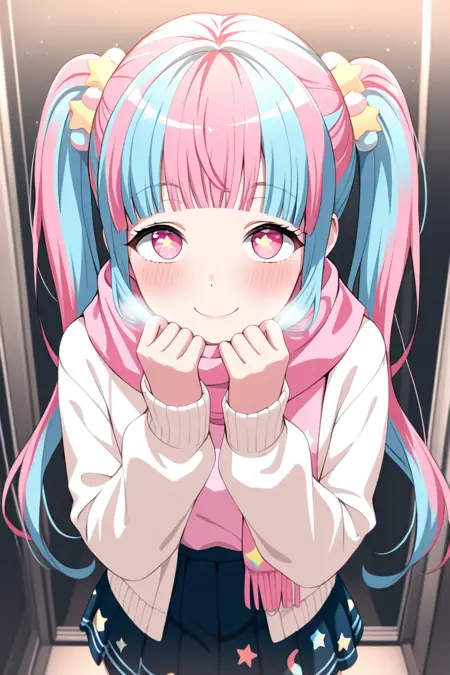 pareo, 1girl, solo, smile, long hair, skirt, twintails, multicolored hair, pink hair, bracelet, jewelry, looking at viewer, hair bobbles, bangs, thighhighs, blue hair, two-tone hair, necklace, casual