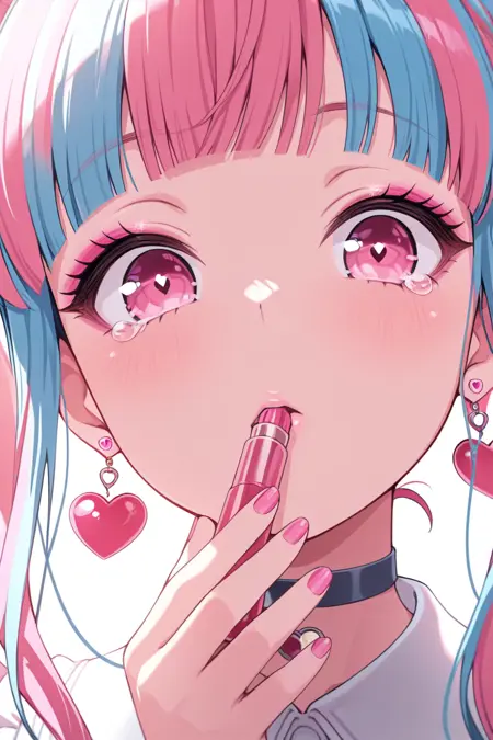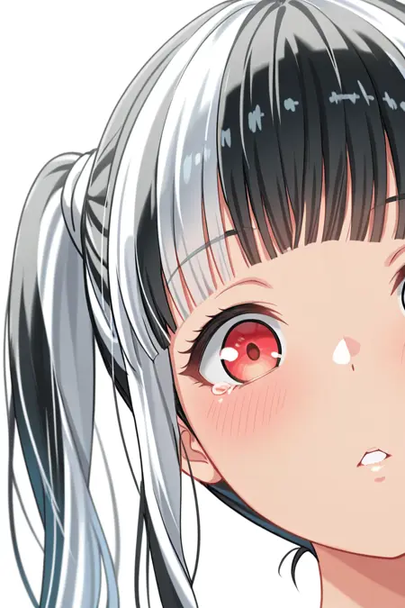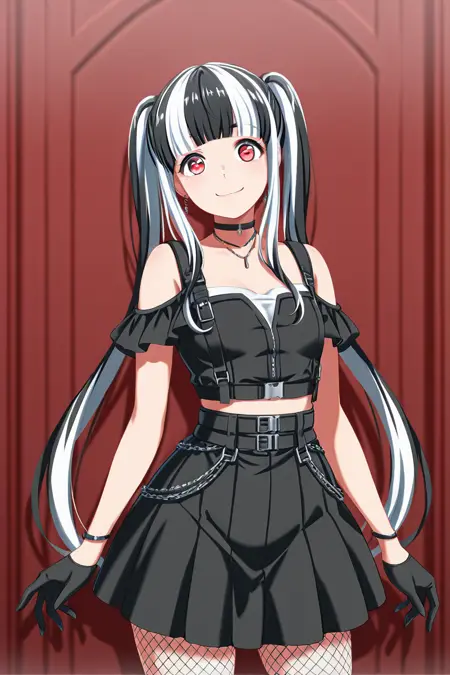 pareo, 1girl, black hair, smile, solo, gloves, multicolored hair, fishnets, long hair, black gloves, white hair, twintails, red eyes, looking at viewer, jewelry, choker, skirt, two-tone hair, onstagesk