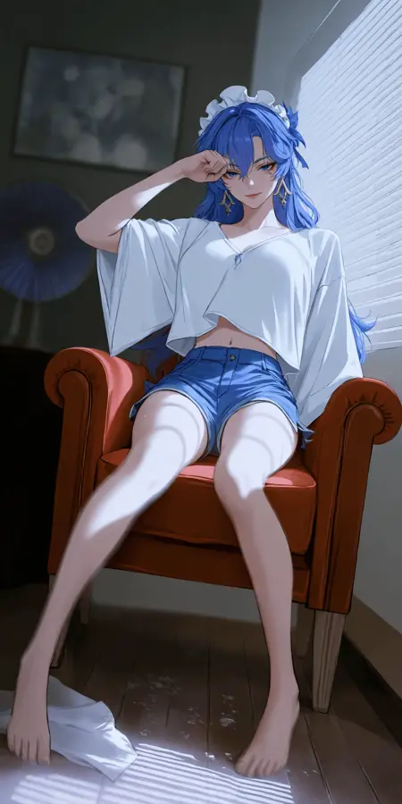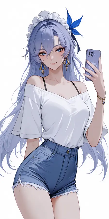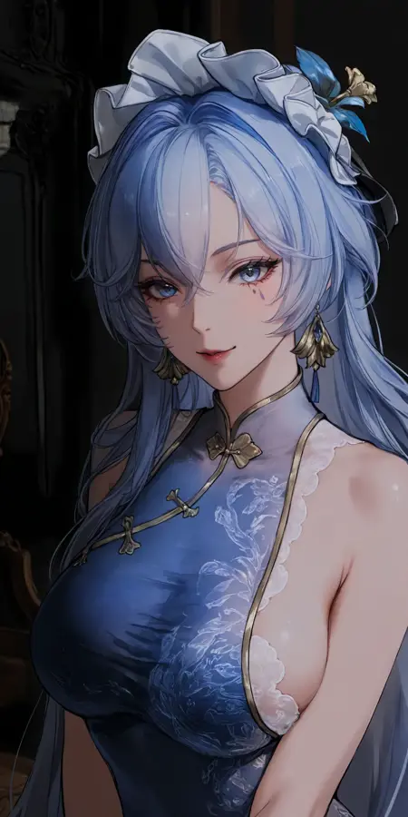 전신: **cantarella\(wuthering waves\),**1girl,solo,blue eyes,long hair,jewelry,earrings,closed mouth,blue hair,smile,hair between eyes,maid headdress,