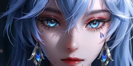 머리: **cantarella\(wuthering waves\),**1girl,solo,blue eyes,long hair,jewelry,earrings,closed mouth,blue hair,smile,hair between eyes,maid headdress,