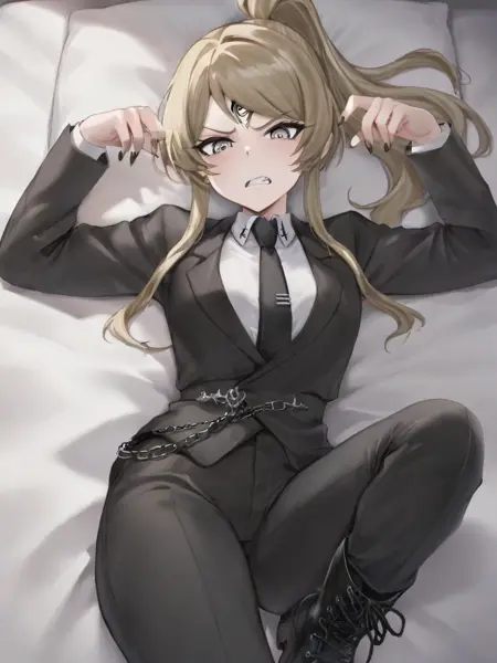 | 학습된 단어 | charlotte van halen, grey eyes, nail polish, long hair, bangs, ponytail, blonde hair, forehead mark, sidelocks, jacket, black jacket, long sleeves, shirt, white shirt, collared shirt, black pants, pants, chain, black necktie, necktie, jewelry, suit, formal, boots, black footwear복사됨! charlotte van halen, yellow eyes, nail polish, long hair, bangs, ponytail, blonde hair, sidelocks, jacket, black jacket, long sleeves, shirt, white shirt, ascot, black pants, high waisted dress pants, tight pants, chain, jewelry suit, formal, boots, black footwear복사됨! |
