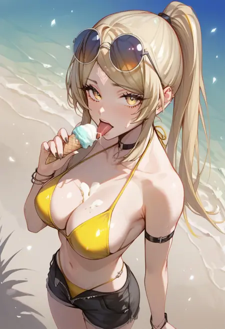 cvh, blonde hair, ponytail, long hair, yellow eyes, forehead eye, parted bangs,