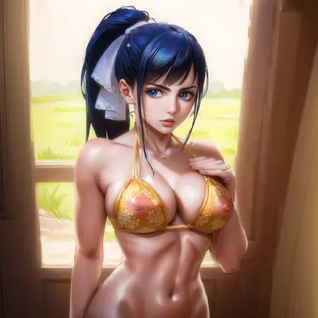 オリジナルの服の設定:lora:Kikunojov320:1(黄色い着物、前髪、ポニーテール、赤い髪飾り)
