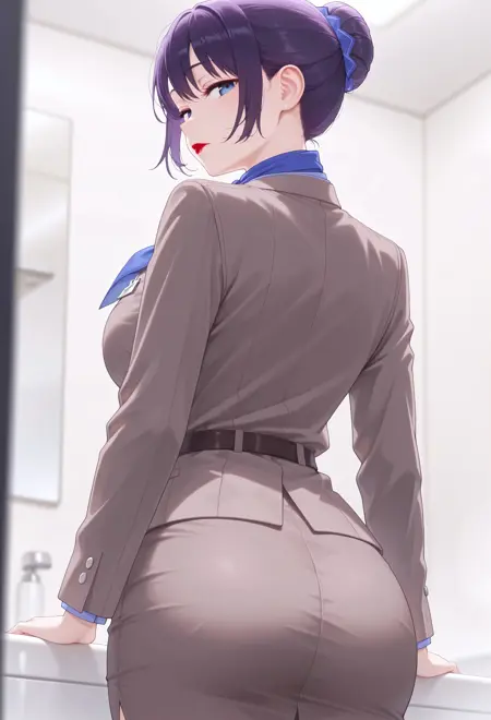 外观:1girl, solo, 深紫色头发, 单发髻, 蓝眼睛, 微张的嘴唇, 口红, 红色口红, 大乳房,