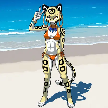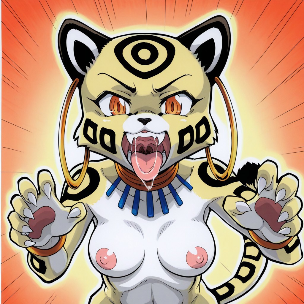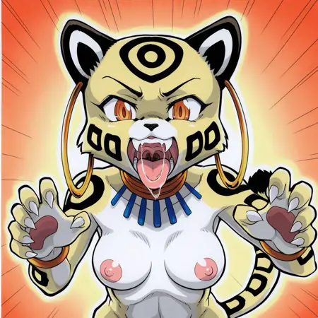cheetah, catgirl, yellow and black fur, black fur patterns, striped tail, black ears, amber eyes, medium breasts, sharp claws, slim body, jewelry, hoop earrings,