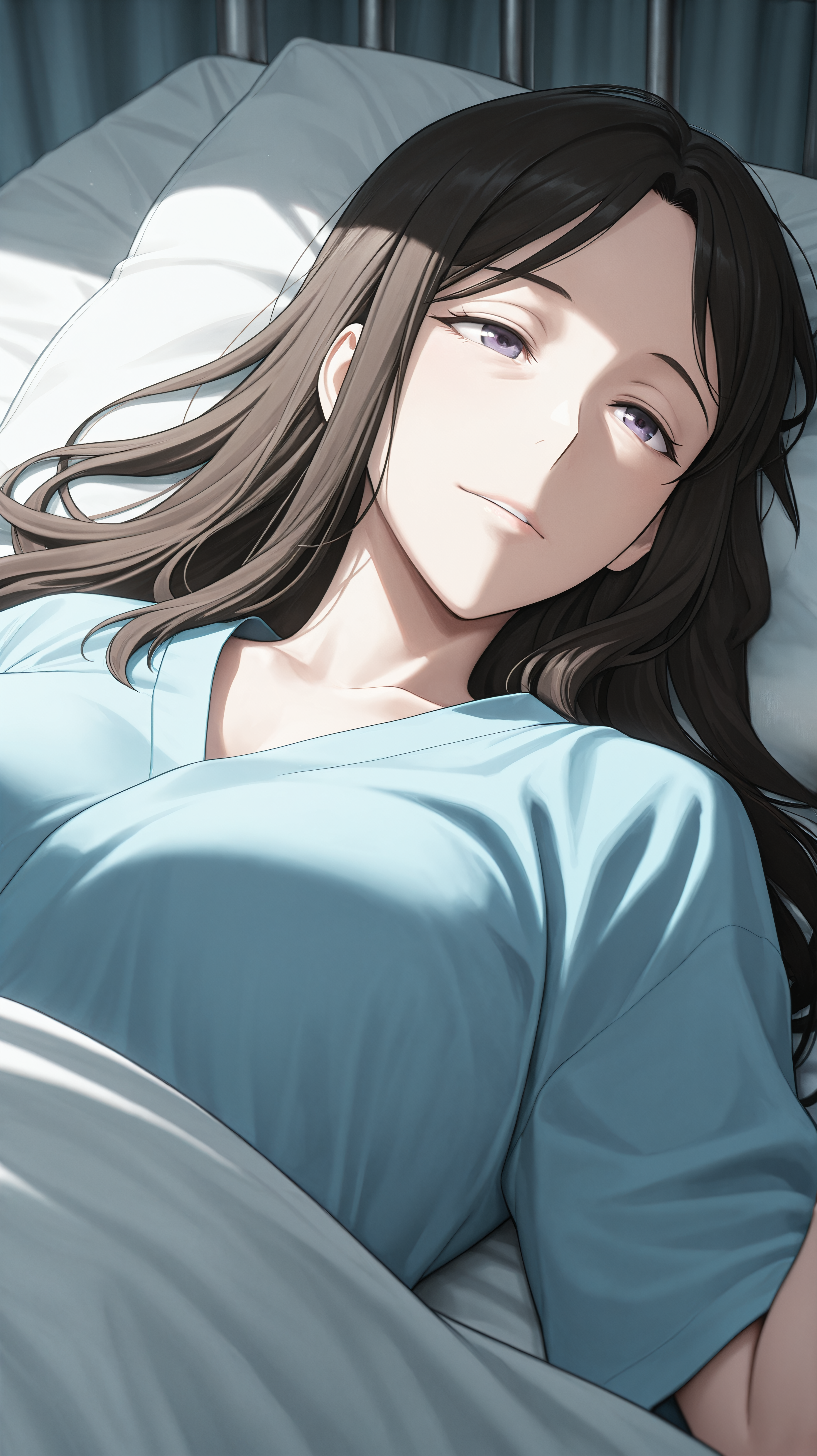 kyung_hye_park_sl, long hair, brown hair, purple eyes, mature, aged up, blue hospital gown,