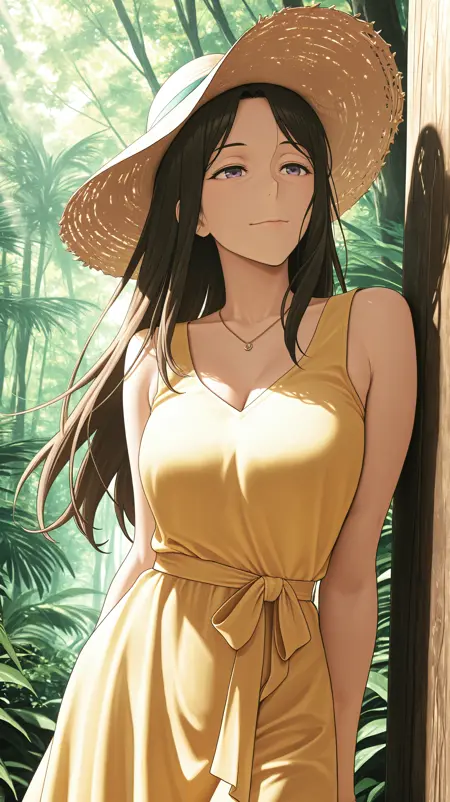 kyung_hye_park_sl, long hair, brown hair, purple eyes, mature, aged up, white shirt, yellow apron,