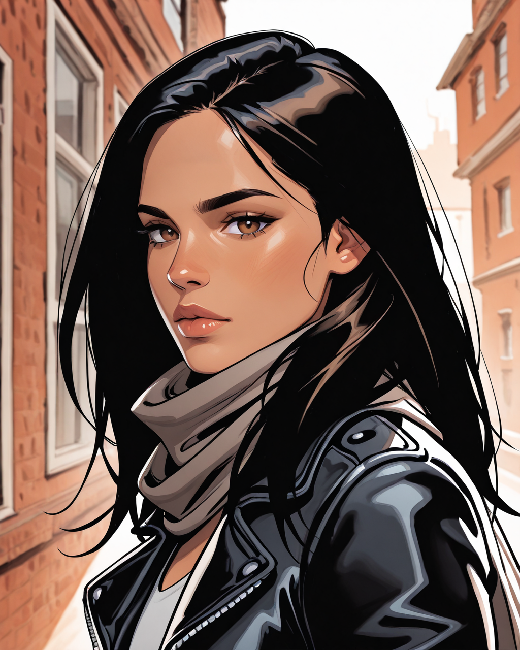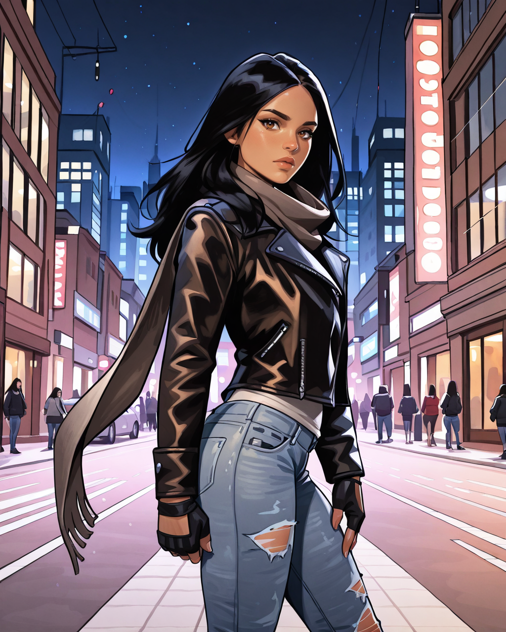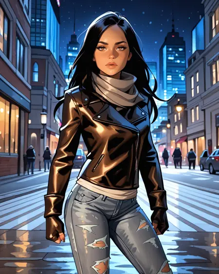 현재: jessicajones, 1girl, 갈색 눈, 긴 머리, 검은 머리, 청바지, 찢어진 청바지, 셔츠, 가죽 재킷, 손가락 없는 장갑, 스카프