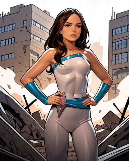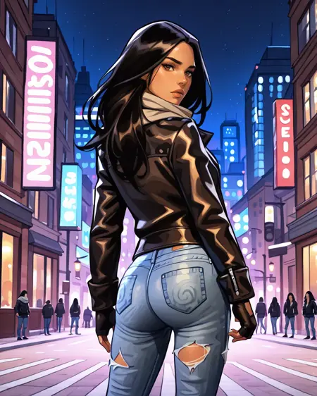 매블 커뮤iks의 제시카 존스. 이는 현재의 간단한 재킷과 청바지 스타일과 펄 장군 복장의 두 가지 모습을 포함합니다.