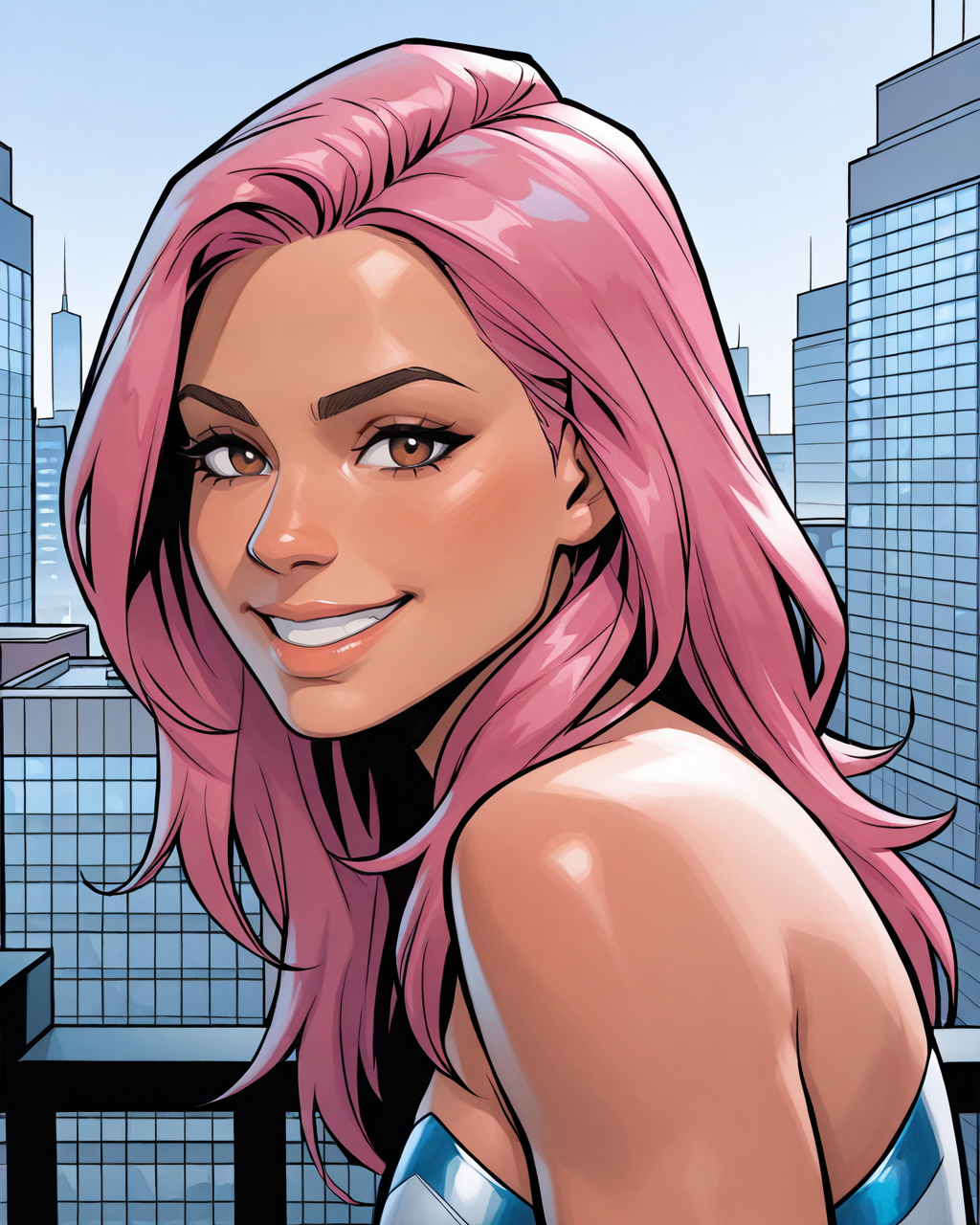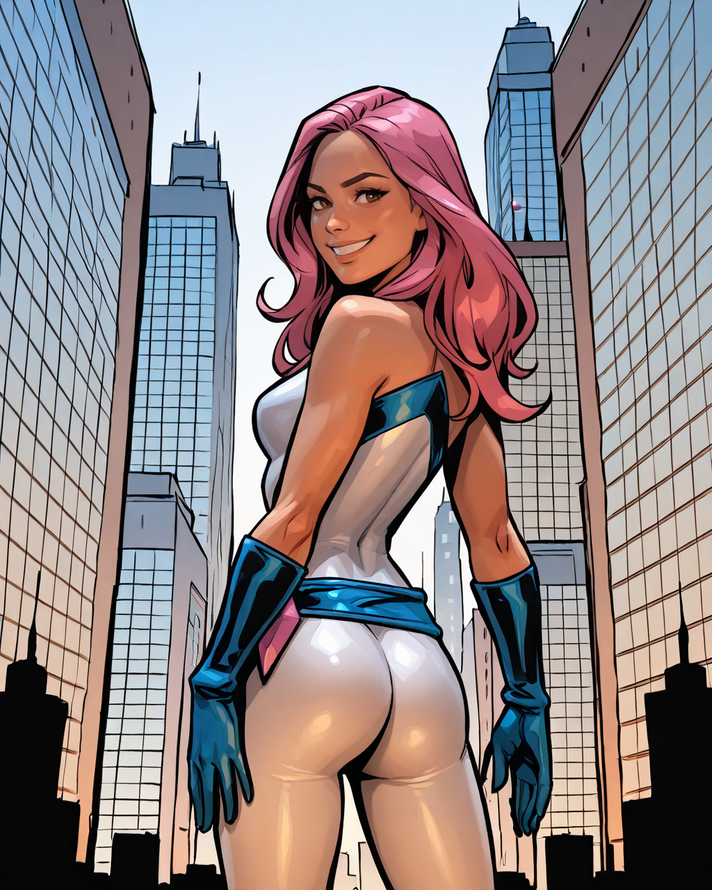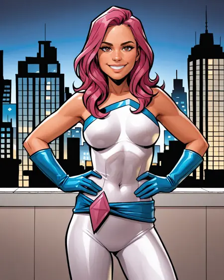 펄: jessicajones, 1girl, 갈색 눈, 긴 머리, 바디수트, 띠, 장갑, 분홍색 머리