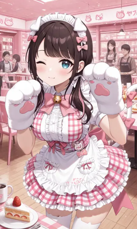 kaga nazuna, nazuna maid, low twintails, hair bow, hair ribbon, maid headdress, fake animal ears, plaid dress, maid, puffy short sleeves, neck bell, pink bowtie, apron, paw gloves, white thighhighs, cat thighhighs, cat tail, tail bow👼5番目の衣装(エンジェル):