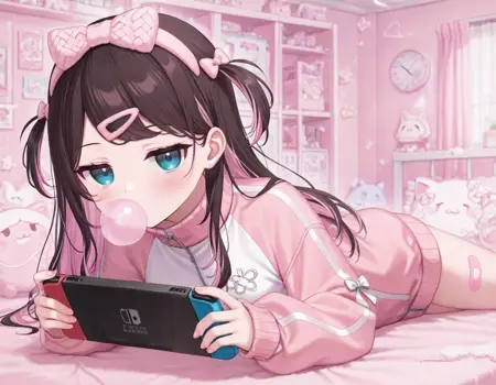 kaga nazuna, nazuna cozy, long hair, two side up, triangle hairclip, hair bow, pink bow, hairband, track jacket, pink jacket, puffy long sleeves, bandaid on legヘアスタイルを次のように変更できます: