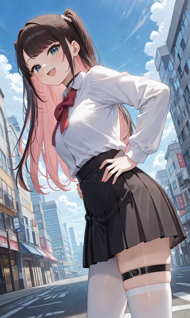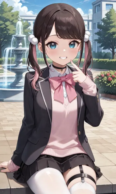 kaga nazuna, nazuna default, two side up, long hair, hair flower, choker, white shirt, collared shirt, red bowtie, pink jacket, hooded jacket, open jacket, black skirt, pleated skirt, single thighhigh, single leg pantyhose, white thighhighs, thigh strap上着を次のように変更できます: