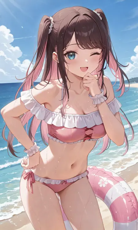 kaga nazuna, nazuna aasummer2023, long hair, two side up, pink bikini, off-shoulder bikini, wrist scrunchie🎀2024年夏服: