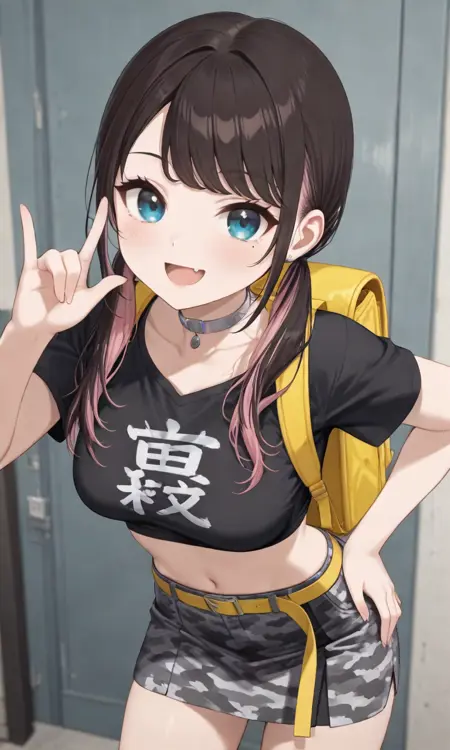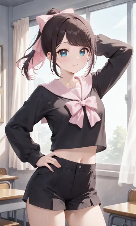 kaga nazuna, nazuna sailor, ponytail, pink hair bow, serafuku, black shirt, pink sailor collar, pink bowtie, long sleeves, midriff peek, black shortsヘアスタイルを次のように変更できます: