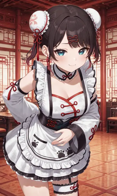 nazuna china, double bun, short hair, twintails, bun cover, knot hair ornament, chinese clothes, alt apron, corset, detached sleeves, frilled thigh strapヘアスタイルを次のように変更できます: