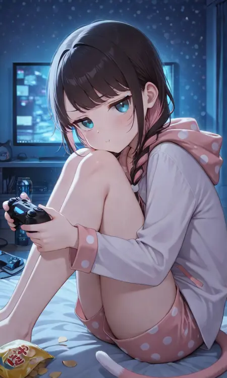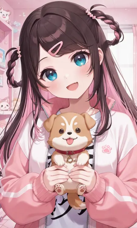 kaga nazuna, nazuna pajama, twin braids, pajamas, hood, pink shorts, polka dot shorts, cat tail🍣デフォルト衣装: