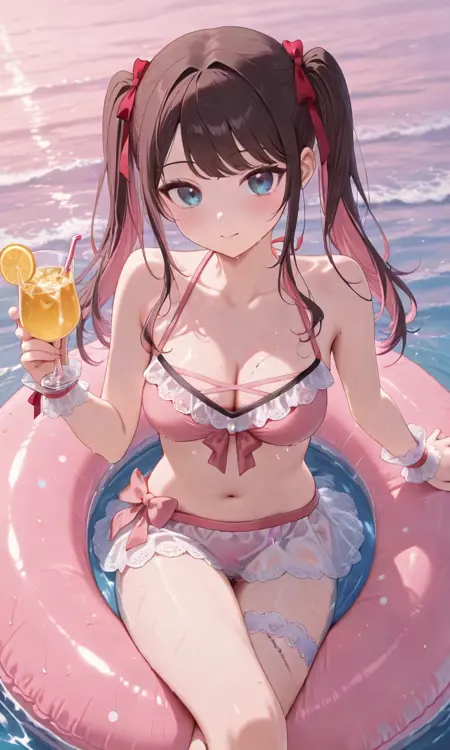 kaga nazuna, nazuna bbsummer2024, long hair, twintails, hair ribbon, red ribbon, pink bikini, front-tie bikini top, halterneck, wrist cuffs, bikini skirt, lace-trimmed thigh strap