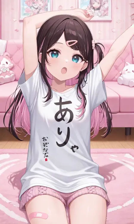 track jacket, pink jacket, puffy long sleeves, open clothes, open jacket, print shirt, alt pink shortsArya Tシャツ: