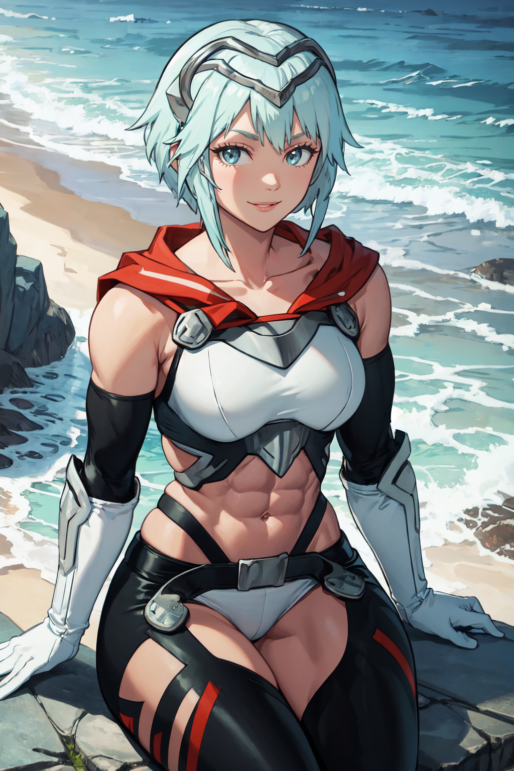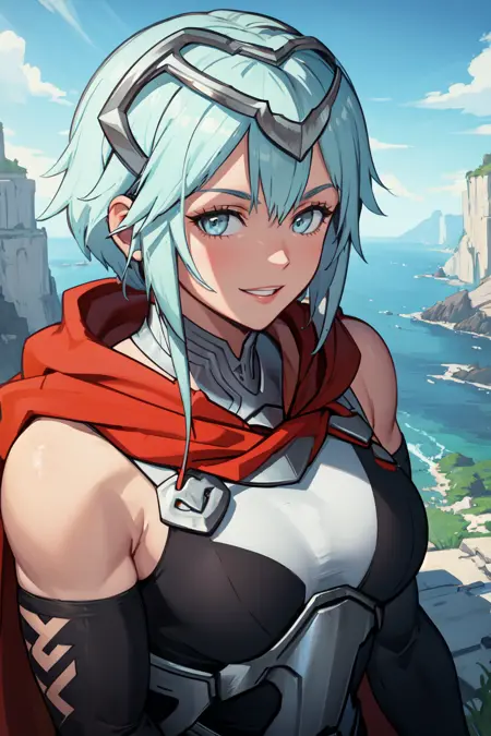 주요 의상: "FEDagrMain, midriff, bare shoulders, tiara, headgear, jewelry, red cloak, armor, breastplate, white top, elbow gloves, white gloves, thigh strap, white underwear, harness, black thighhighs, thigh cutout, belt".