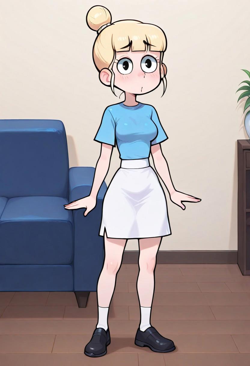 基本の服装 - 金髪、短髪、髪の結び目、黒い目、青いシャツ、白いスカート、白い靴下、黒い靴