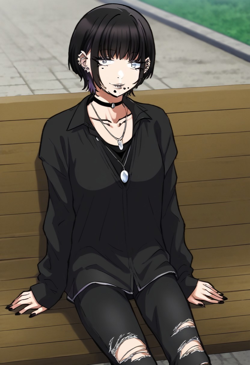 | 학습된 단어 | Toka Mukuroji, black shoulder-length hair, lavender under-dye, glossy underlip, ear piercings, lip piercing,복사됨! main ourfit, black choker necklace, pendant necklace, white headphones around neck, white button-up shirt, black jacket draped over shoulders, grey plaid skirt,복사됨! |