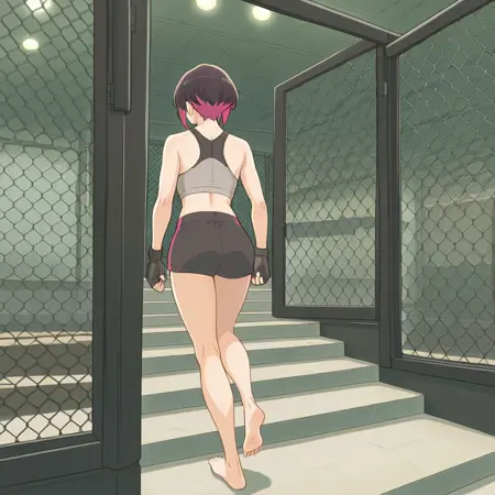 masterpiece, best quality, amazing quality, 1girl, solo, crowds, multicolored hair, ((mmacage)), enteringcage, moving upstairs, mma door, 1girl, gloves, solo, fingerless gloves, short hair, barefoot, from behind, sports bra, shorts,