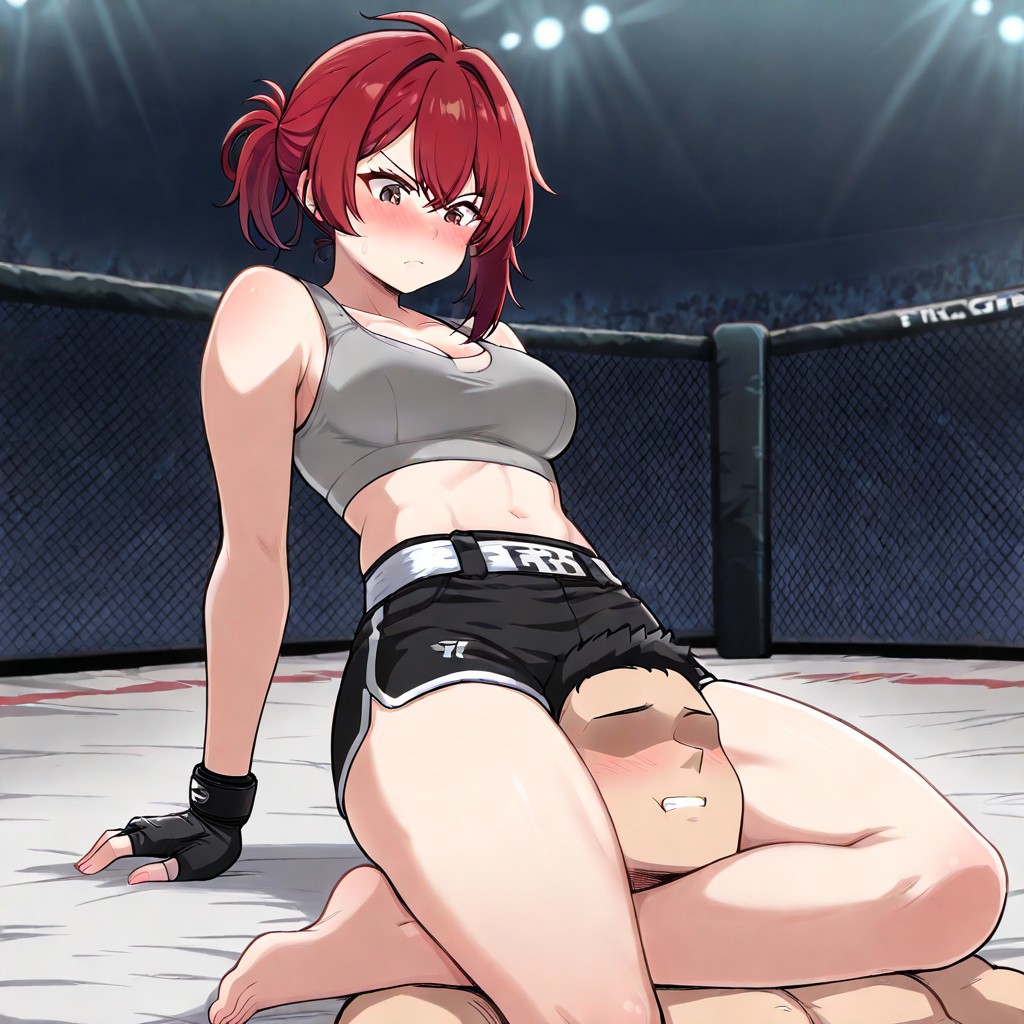 masterpiece, best quality, amazing quality, side perspective shot, 1boy, 1 girl, headsciss++, animee, legstrangle++, mmacage, incagefighting, 1girl (빨간 머리, 허벅지 스포츠 브라), hetero, faceless male, bold, between thighs+, blush, asphyxiation+, fingerless gloves, gloves, wrestling ring,