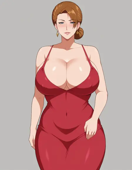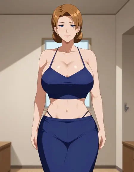 Eleanor, 1girl, solo, breasts, blue eyes, skirt, pantyhose, jewelry, ring, single hair bun, brown hair, hair bun, short hair, large breasts, looking at viewer, uniform, mature female, jacket, blue jacket,