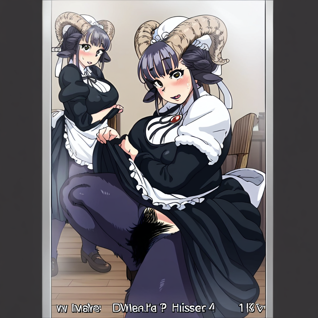 | トレーニングワード | 1girl, solo, mayagoat, black hair,yellow eyes, horizontal pupils,mole under eye,curled horns,goat horns, goat ears, animal ears,braid, blunt bangs,makeup,eyeshadow,monster girl,goat tail,コピーしました! maid,mob cap,maid headdress,puffy sleeves,juliet sleeves, long sleeves,brooch, black dress, white apron,コピーしました! pubic hair, excessive pubic hair, fur on legs, legs fur,hooves,コピーしました! |