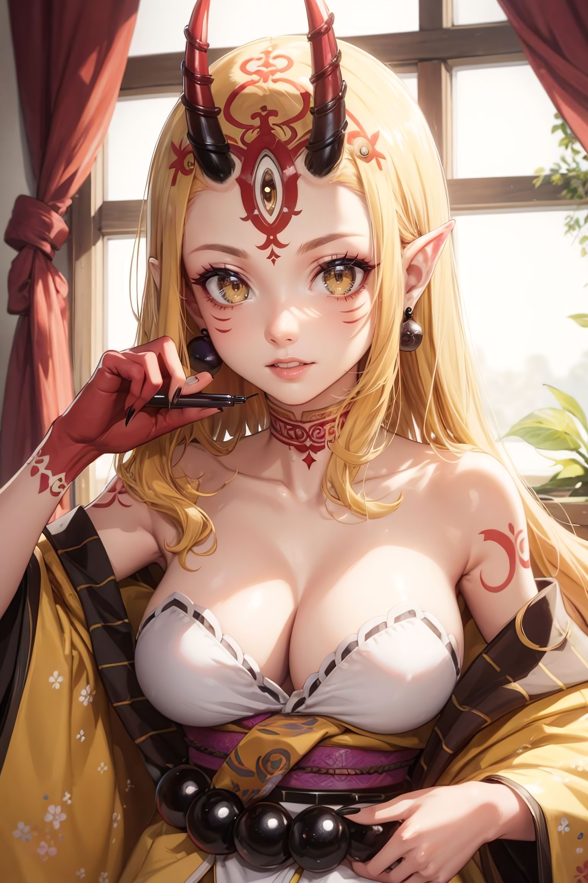 ibaraki_douji, 日本服饰, 和服, 指甲, 裸露肩膀, 露肩, 黄色和服, 额头印记, 尖锐指甲, 珠宝, 耳环
