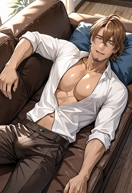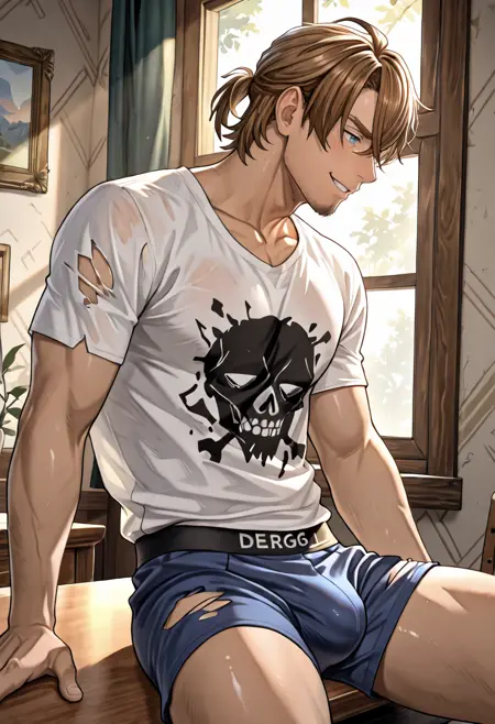 Heigl, Heigl_brown_hair, short ponytail, Heigl_blue_eyes, heigl_van_dyke_goatee, Heigl_white_open_shirt, gloves, Heigl_brown_vest, Heigl_chest_strap, Heighl_green_cape, Heigl_brown_pants