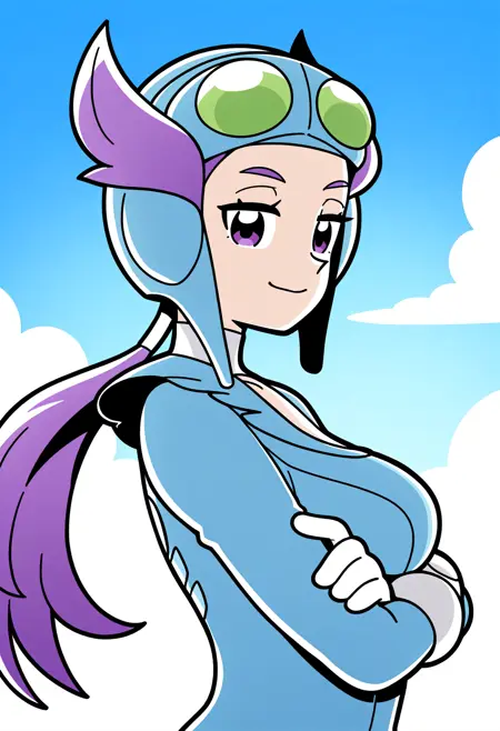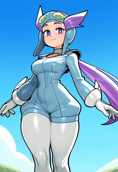 Key word is w1nona and for default appearance use: purple eyes, purple hair, low ponytail, pilot helmet, pilot suit, white gloves, white pants, shoes,
