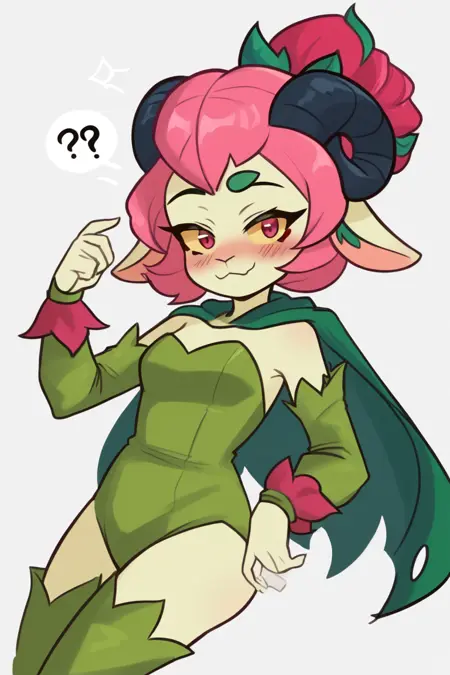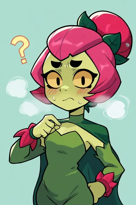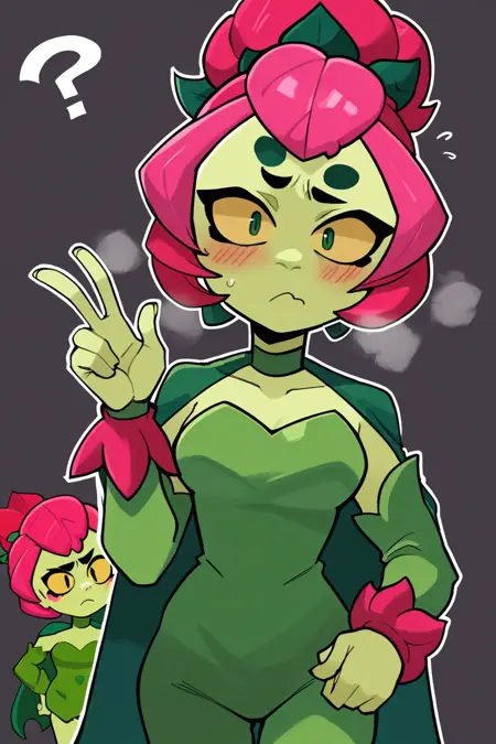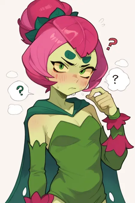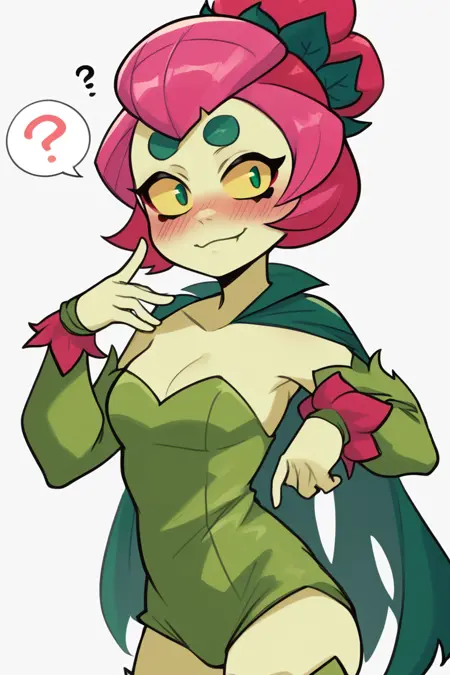 rsicharlie , 1 girl ,pink hair ,hair bun ,colored sclera ,green skin , green bodysuit,leotard,Green long stockings , green sleeves ,cape , solo