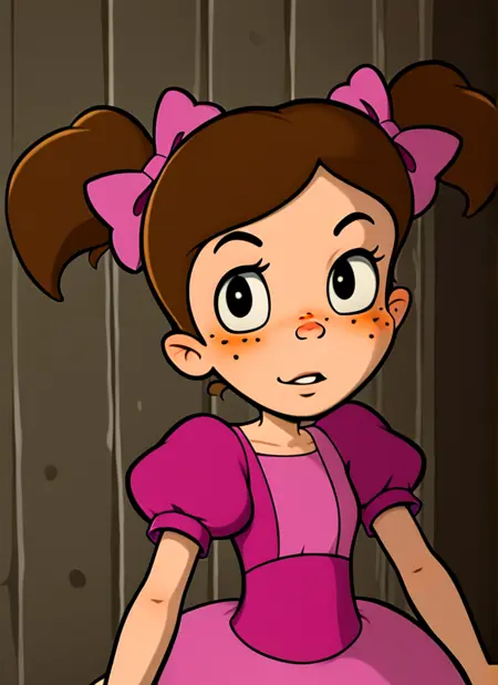 twintails, brown hair, hair bow, freckles, dress, puffy sleeves