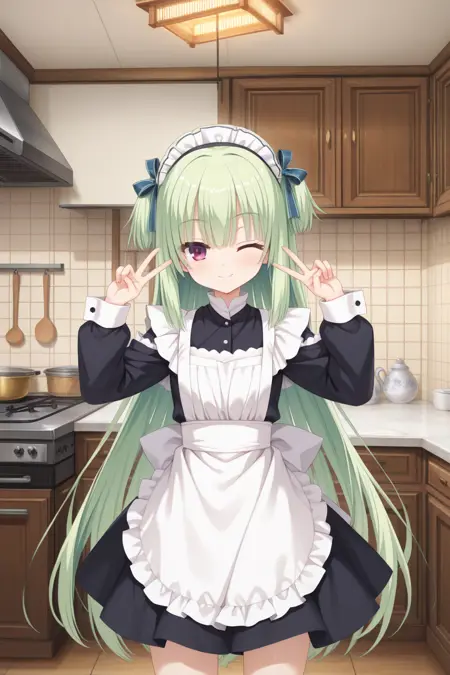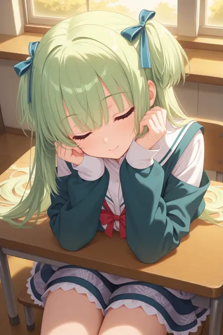ddmurasame, 빨간 눈, 초록색 머리카락, 양쪽 위로 올린 머리, 파란 머리 리본, murasameschool, 흰색 해군 칼라 학생복, 흰 셔츠, 파란 재킷, 짧은 재킷, 빨간 리본, 소매가 손목을 넘어감, 파란 치마, 계층적 치마, 회색 치마, 프린트 치마, 프릴이 있는 치마,