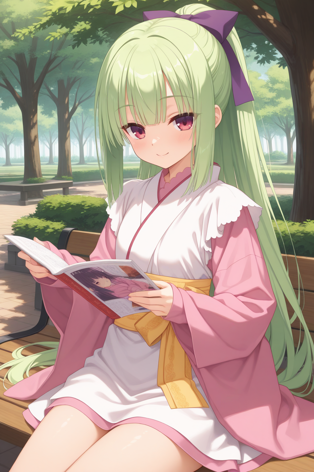 bbmurasame, 빨간 눈, 초록색 머리카락, 보라색 머리 리본, 포니테일, murasamecasual, 분홍색 기모노, 흰색 기모노, 소매가 손목을 넘어감, 긴 소매 위에 짧은 소매, 짧은 기모노, 프릴이 있는 기모노, 노랑 띠,