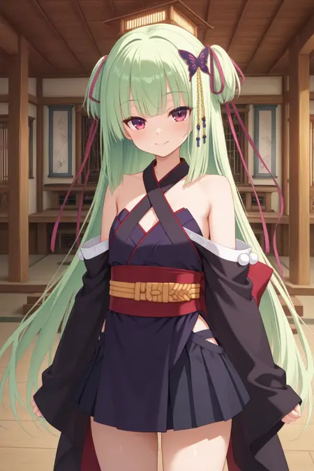 aamurasame, 빨간 눈, 초록색 머리카락, 히메 컷, 양쪽 위로 올린 머리, 빨간 머리 리본, 나비 모양 머리 장식, murasamekimono, 일본 복장, 검은 기모노, 소매 없는 기모노, 짧은 기모노, 십자형 헬터, 드러난 어깨, 분리된 소매, 검은 소매, 소매가 손목을 넘어감, 빨간 띠, 주름진 치마, 검은 치마,