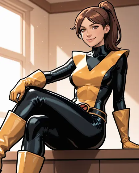 현대 X-Men: shadowcat, 1girl, 갈색 머리, 긴 머리, 갈색 눈, 포니테일, 노란색 바디수트, 벨트, 장갑, 부츠,