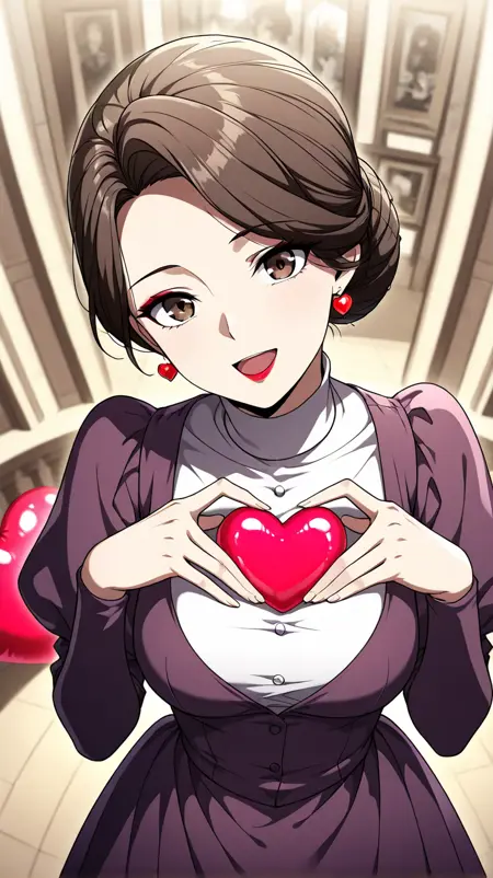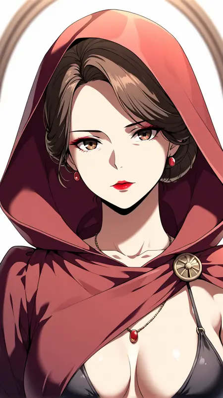 1girl, solo, il_priscilla, brown hair, single hair bun, hair bun, short hair, brown eyes, lipstick, makeup, medium breasts, mature female,