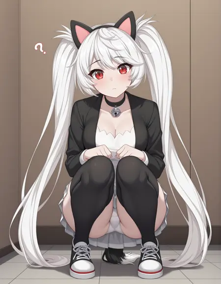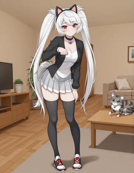 quillillu, black choker, white shirt, black jacket, black thighhighs, neck bell, pleated skirt,