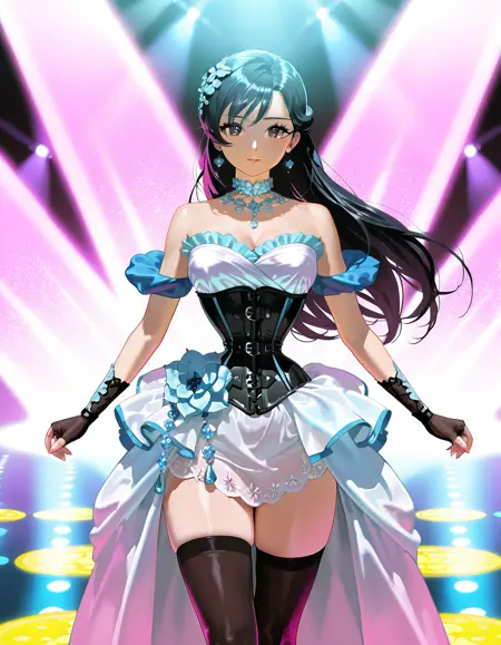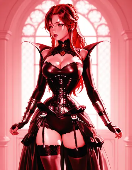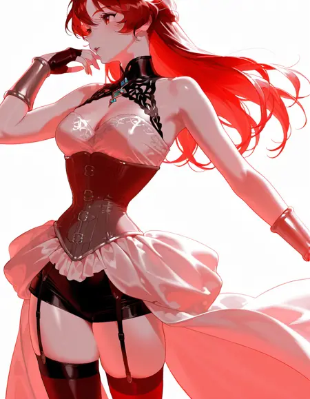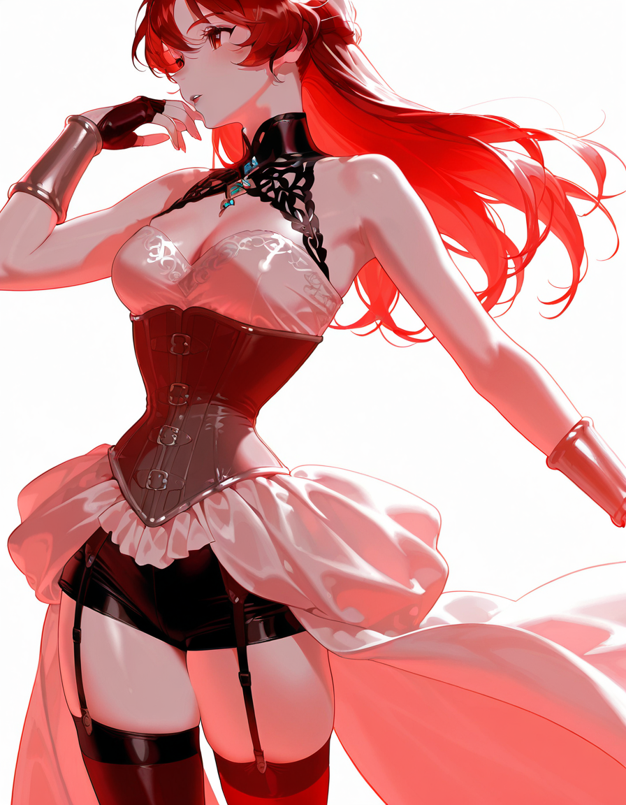 1girl, fingerless gloves, hud_tightwaist, thighhighs, dress, corset